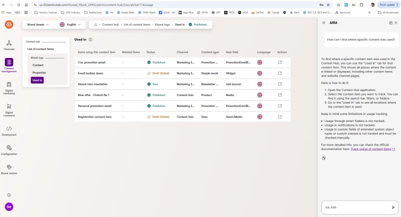 Even finding Content Reuse Locator is easy, thanks to AIRA, the AI-powered assistant built into Xperience by Kentico. Just ask, “How can I find where a specific content was used?” and AIRA will guide you directly to the “Used in” tab for your chosen content item. There, you’ll see every location it’s used across other content items, pages, and digital channels.