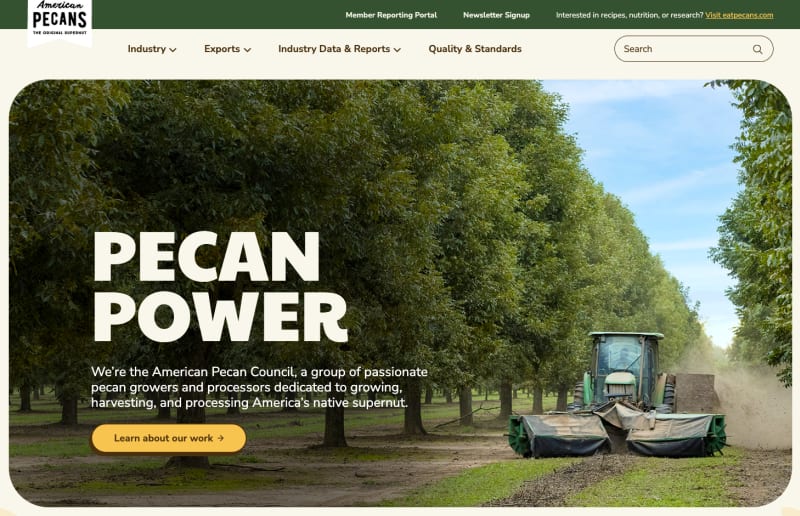American Pecan Council’s new site is user-friendly with an inviting design; offering industry reports, financial statements, and interactive data on the pecan industry. Members can sign up for reporting tools, news, and a current calendar of events. Visitors can also access resources and sign up for the newsletter to stay updated.